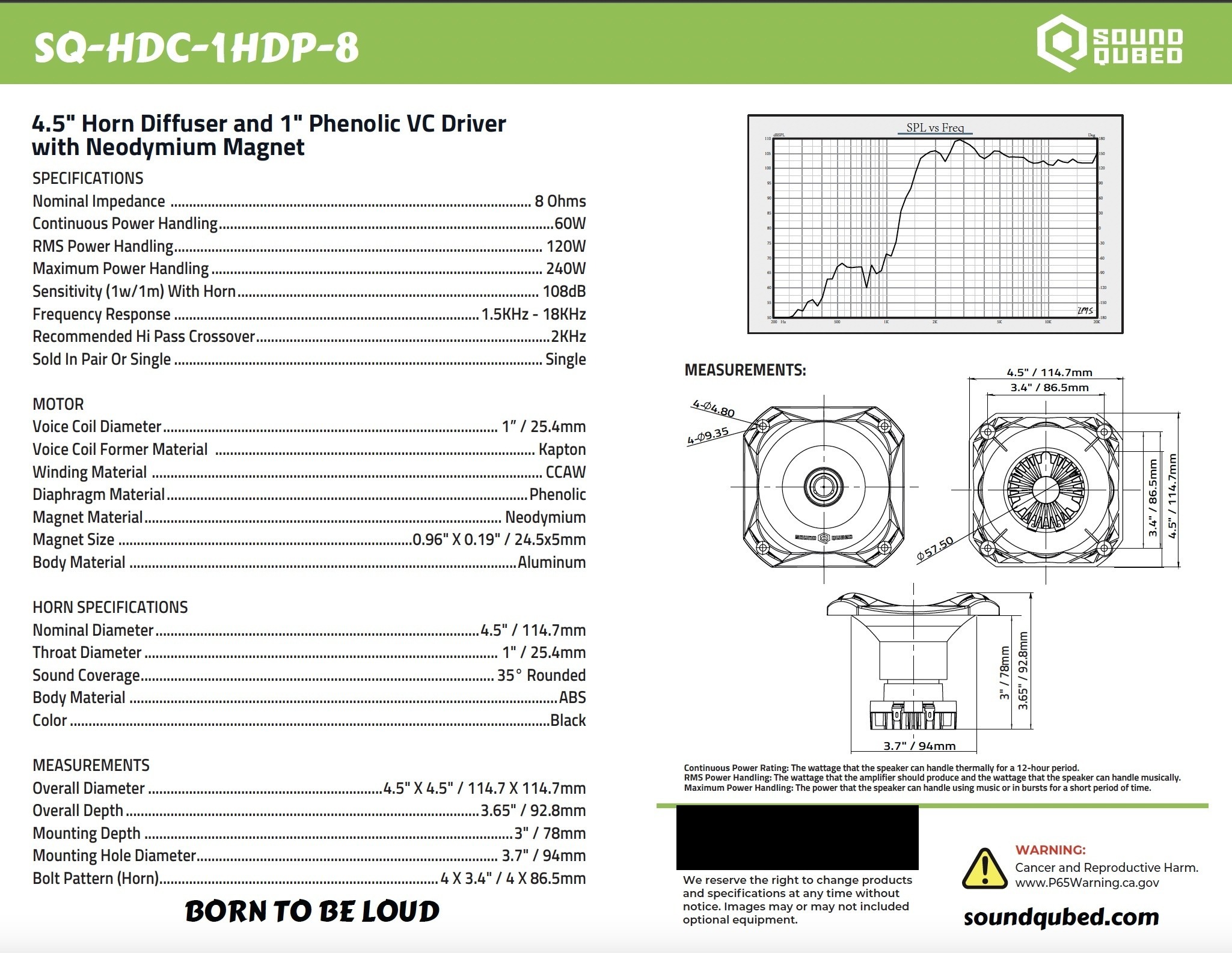 The SoundQubed SQ-HDC-1HDP-8 is a 4.5" horn diffuser paired with a 1" phenolic voice coil driver featuring a powerful neodymium magnet. Engineered for superior sound quality, this driver offers high efficiency and exceptional performance, making it ideal for professional audio and loudspeaker applications.